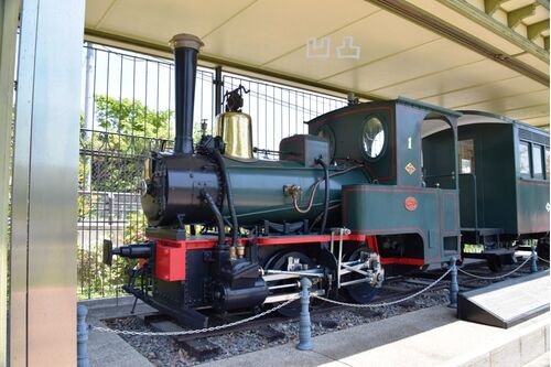 ※2022年5月撮影 本家坊っちゃん列車を見に行ってきました。 伊予鉄道1号機 明治21年ドイツ製、伊予鉄開業時に製造された機関車です。 この機関車はレプリカが多数制作されていますが、これはその本物です。 説明板 鉄道記念物に指定されています。 銘板 動輪…