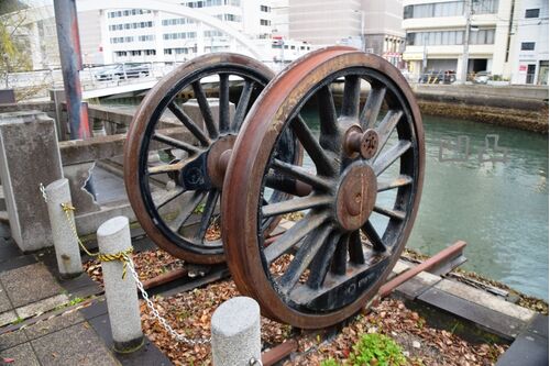 佐賀に続いて長崎にも上陸! ※2023年3月撮影 動輪 刻印が全く見えず、形式など全て不明です。 民営化時に廃止となった長崎駅から出島辺りの長崎港駅まで伸びていた線路の廃線跡上に設置されています。 反対側 裏手に架かっていた橋は撤去されており、線路が…