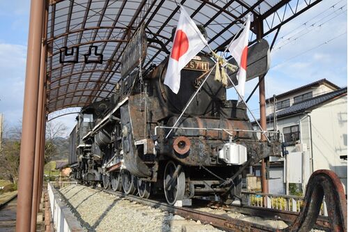 ※2024年12月 C57形11号機 昭和12年汽車製造製、中国地方を主に走っていた機関車です。 ご当地豊岡にも数年配置され、昭和47年に福知山で廃車となっています。 訪問が年末だったこともあり、国旗が掲揚されていました。 説明板 動輪 銘板 反対側 腕木式信号機…
