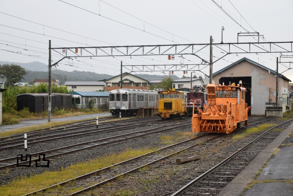 駅併設の車庫にある廃車体や引退車両を眺めます。